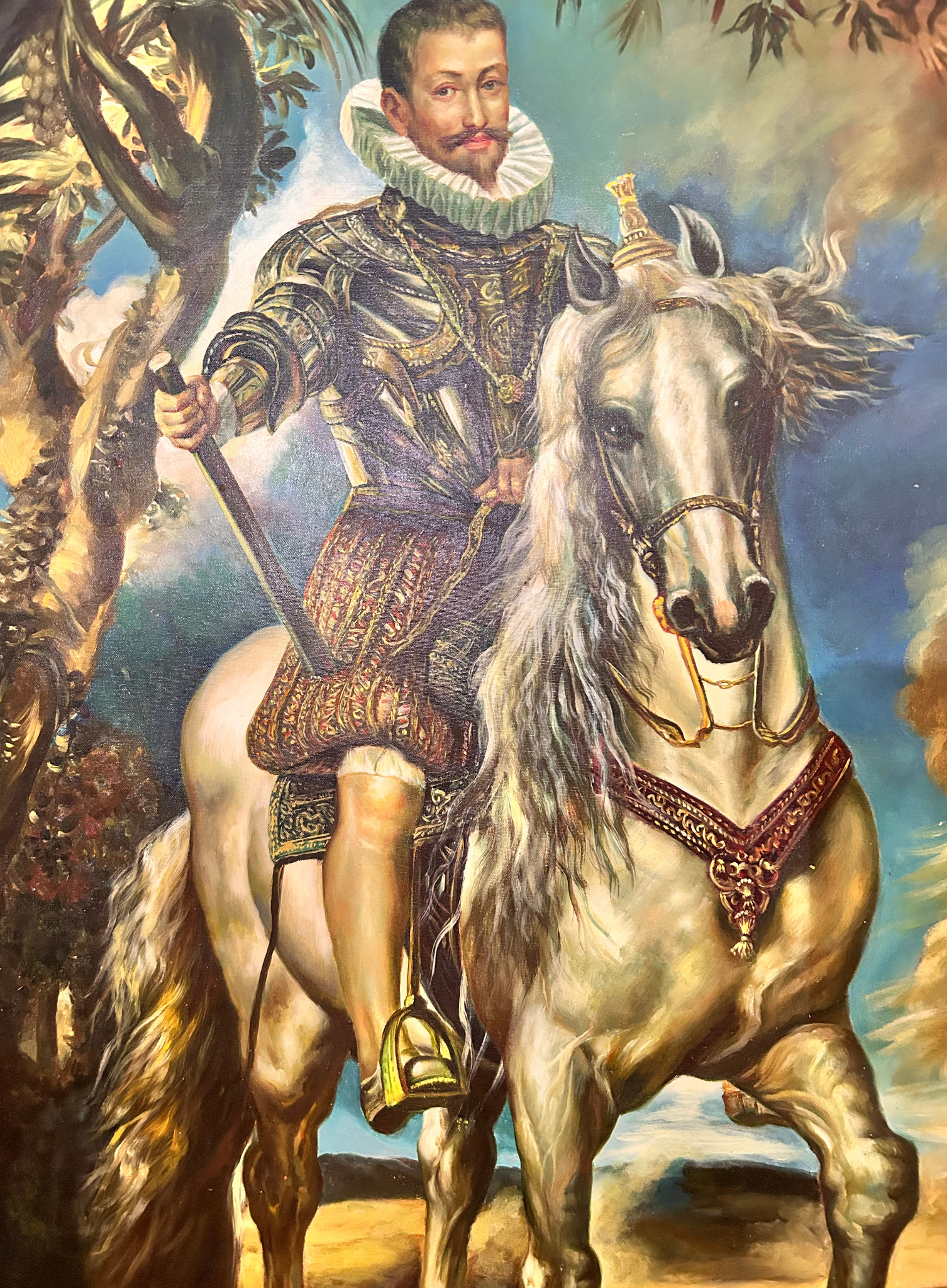 Beautiful large hand-painted oil on canvas depicting a nobleman on horseback in Renaissance-era armor — a striking reproduction in the style of El Greco’s “Equestrian Portrait of a Nobleman”