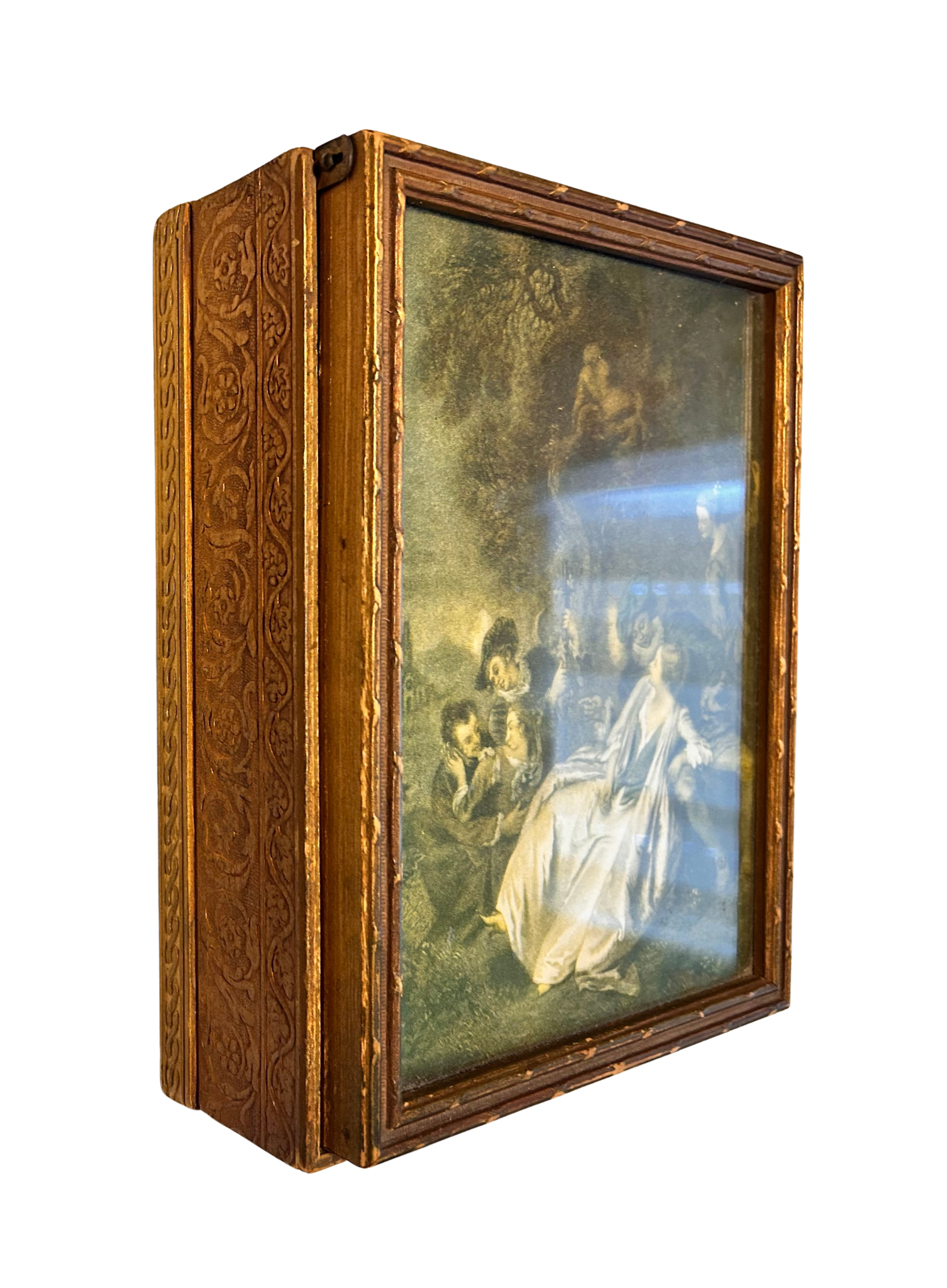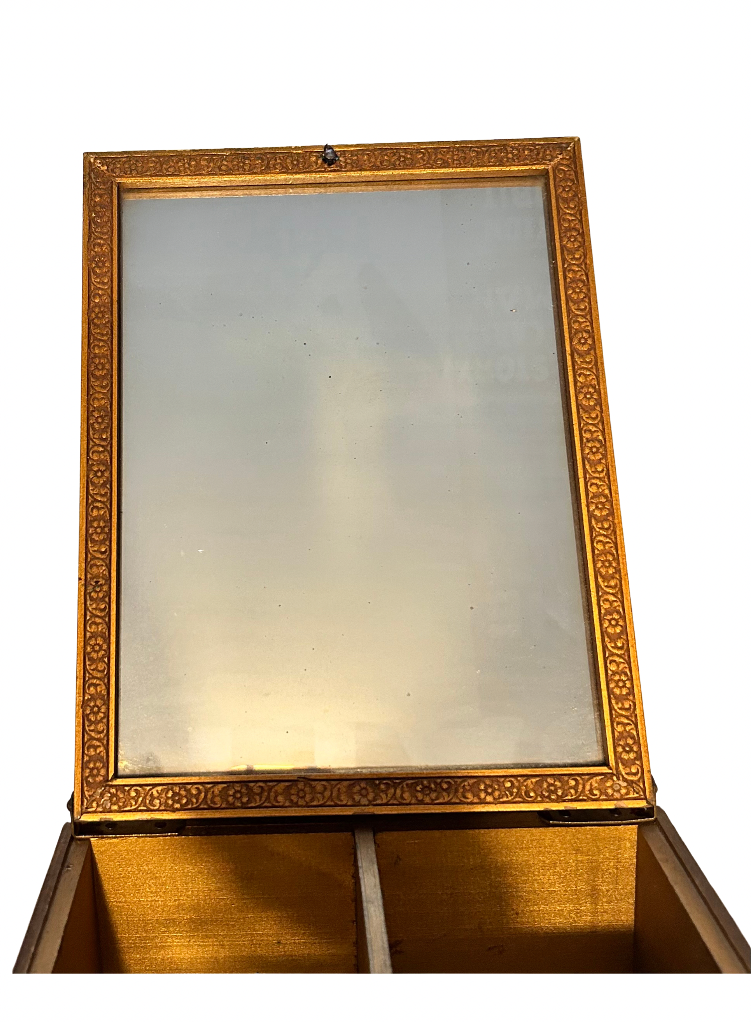 Beautiful vintage gold-gilt wood jewelry box featuring an ornate embossed floral border and a framed Rococo-style art print on the lid. The interior includes a mirror and divided storage compartments. Classic early 20th century “boudoir box” design.